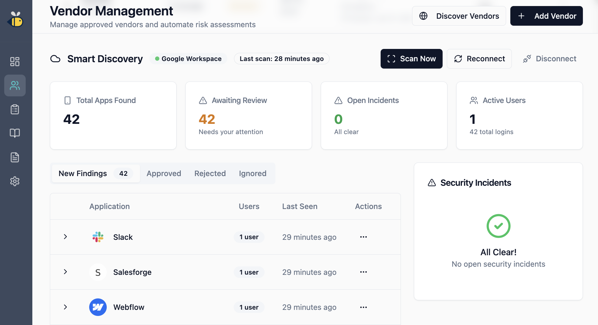 RiskBeeは継続的VRMエンジンとしてShadow ITを自動検出し、AIで法的条項を瞬時に審査します。中小企業とMSP向けに、手動審査の高コストを削減し、スプレッドシート依存を排除します。...