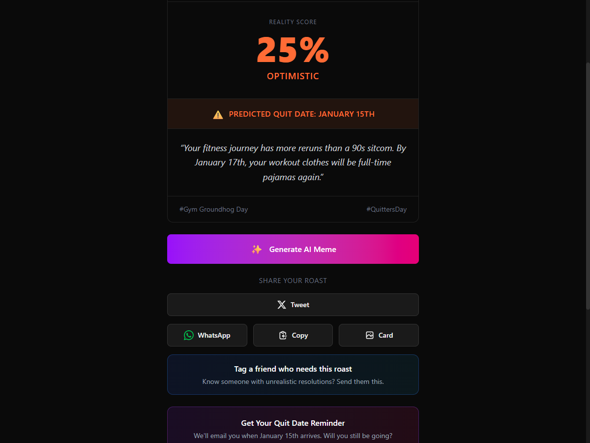 ##概要 新年の決意を徹底的に揶揄し、挫折時期を予測するAIサービス。目標を入力し自信度を評価すると、個別の挫折日と共有可能な揶揄カードが生成され、現実を直視するモチベーションを提供します。現在...