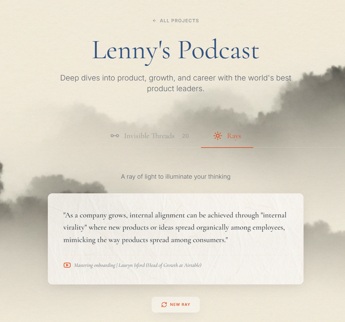 ## コンセプト AIを使って膨大な情報源からアイデアのつながりを可視化します。 ## 特長 - 複数コンテンツ間の非自明な洞察を発見 - ノイズの中の信号を抽出して全体像を提示 ## 活用...