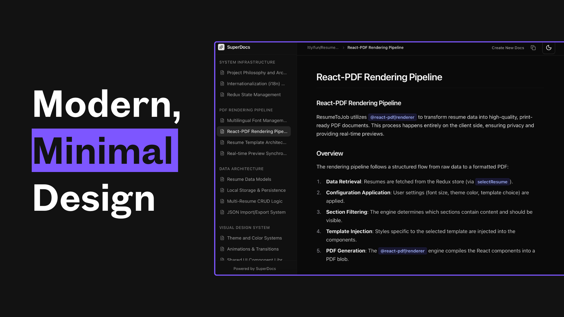 ## 概要 SuperDocs はコードベースを読み取り、GitBook風のクリーンなドキュメントを自動生成します。コードが更新されればドキュメントも自動更新され、Markdown の地獄や古い...
