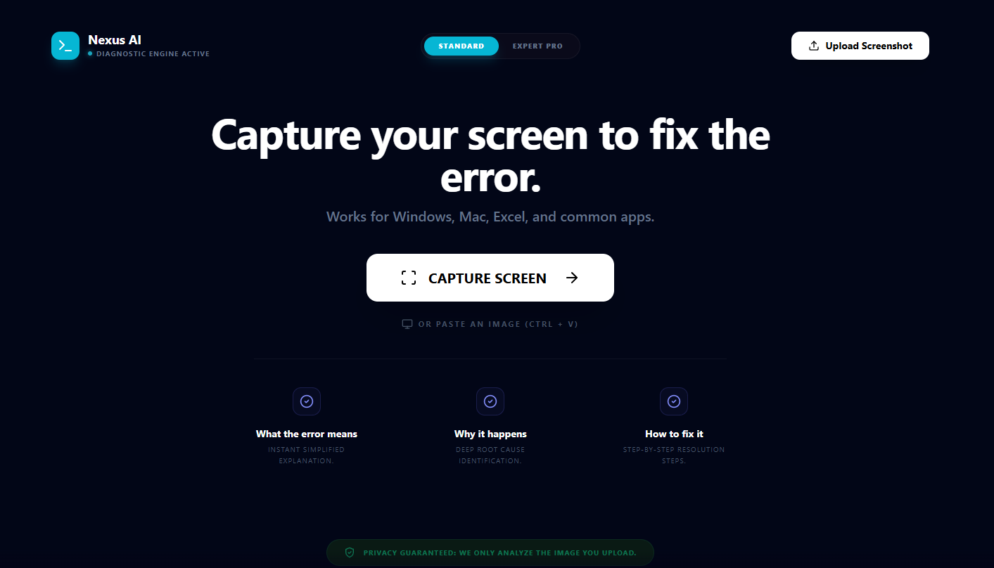 ## 概要 - どんなスクリーンショットからでも技術的エラーを即座に修正できるサポート。Vision AI がエラーを分析し、分かりやすい手順付きの解決策を提示します。アップロードするだけでエラ...