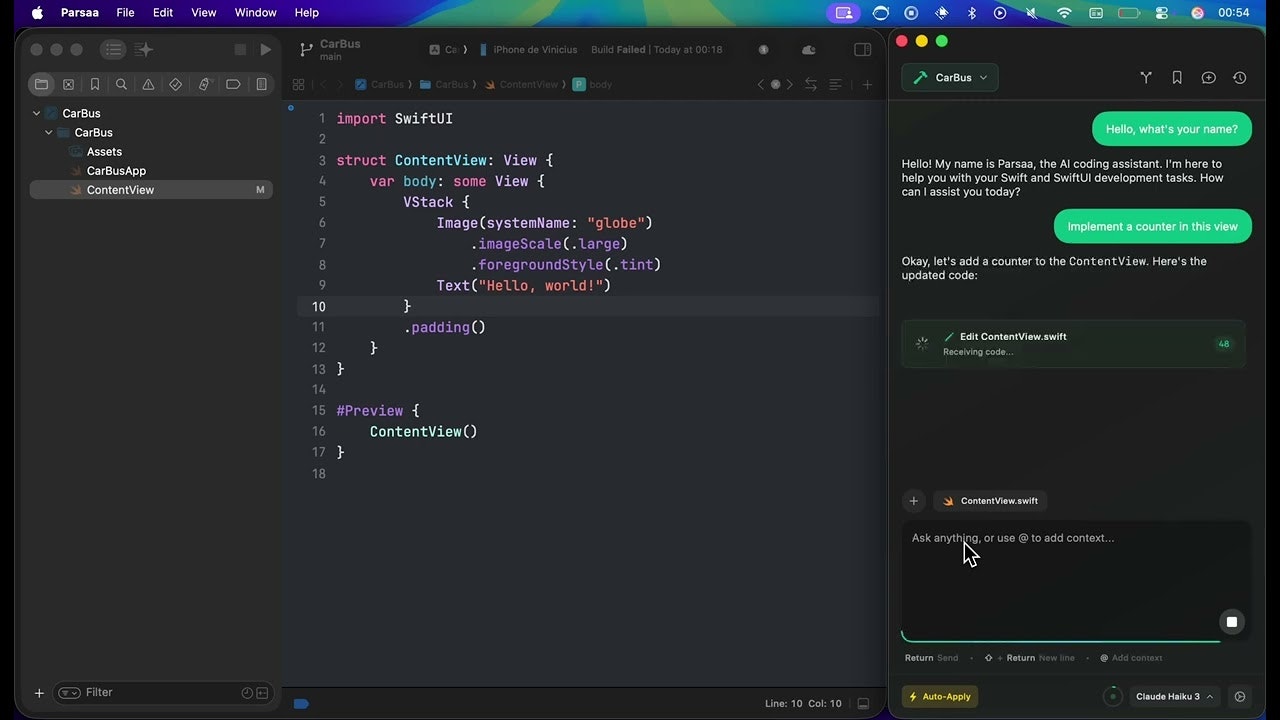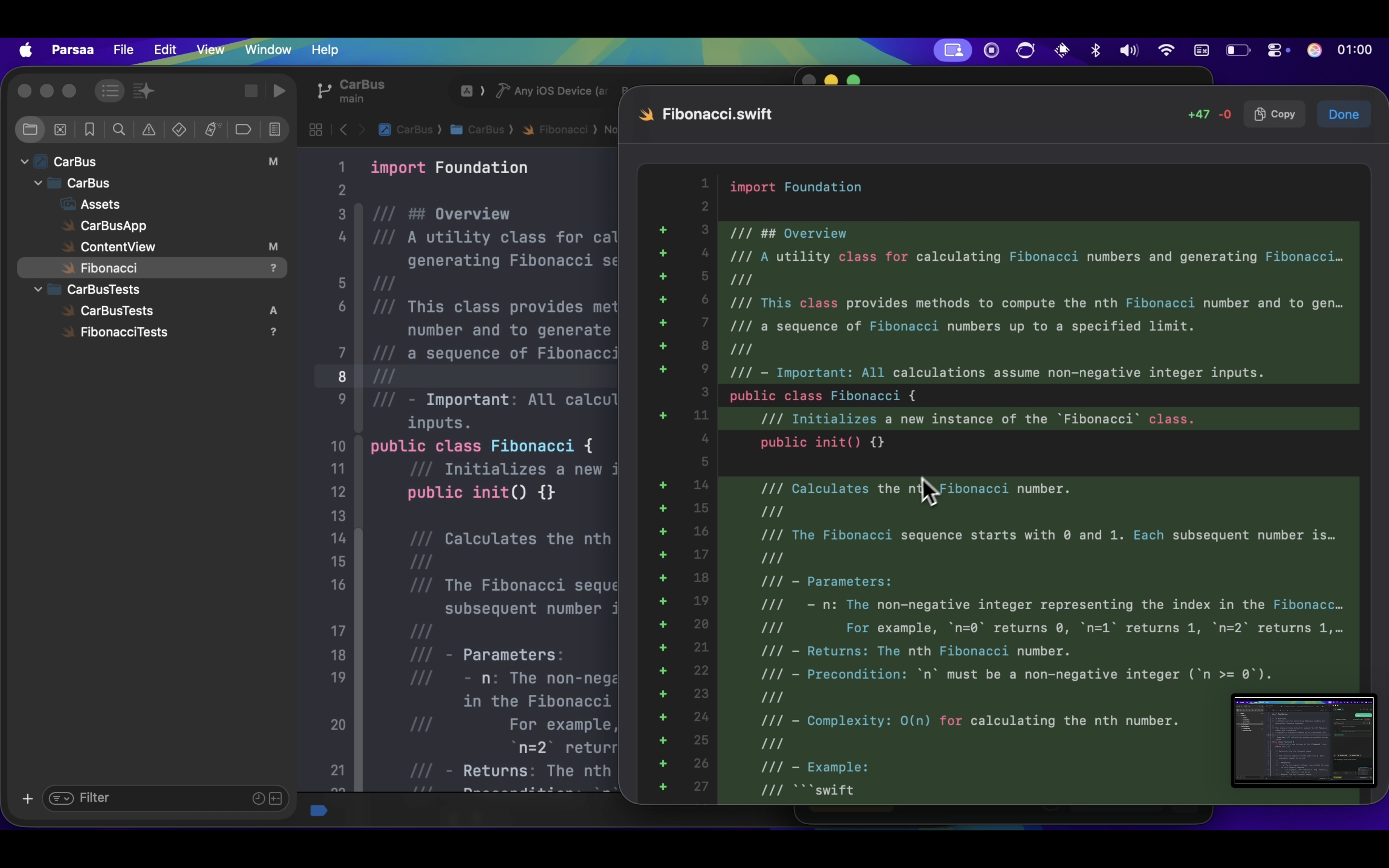 ParsaaはXcode内に統合されたAIコード作成エージェント。Swift/SwiftUIコードの生成・デバッグ・最適化、コードベースのセマンティック検索、ドキュメントとXCTestの自動生成...