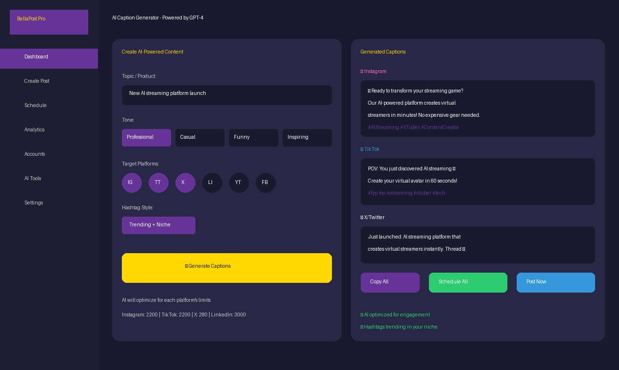 ## 概要 BellaPost Proは26以上のプラットフォームに対応するAI搭載のソーシャルメディア自動化ツールです。Instagram、TikTok、X、LinkedIn、YouTubeな...