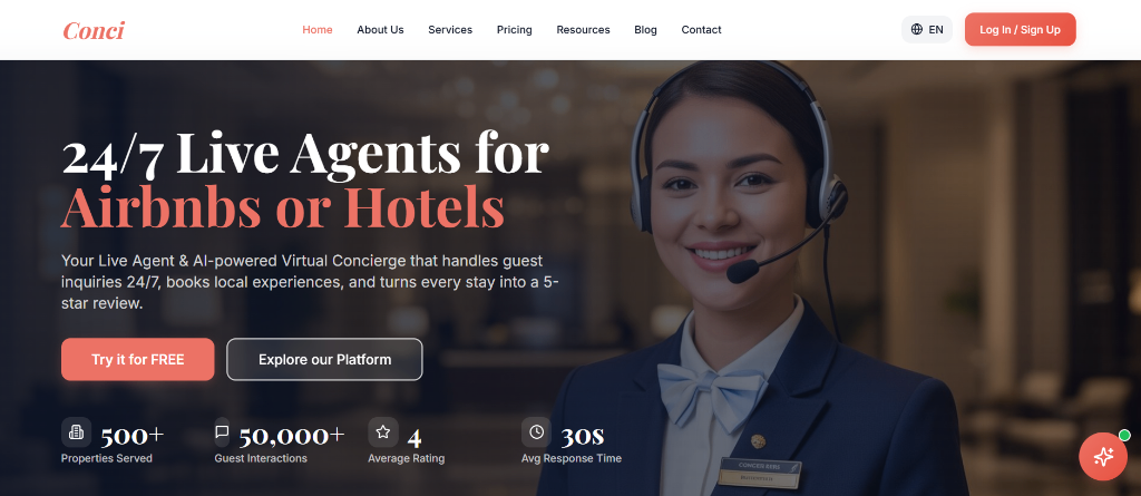 ## 概要 ConciはAirbnbホスト・民泊・ホテル向けに、24時間365日対応のライブエージェントとAI搭載の仮想コンシェルジュを提供します。ゲストからの問い合わせ対応、現地体験の予約代行...