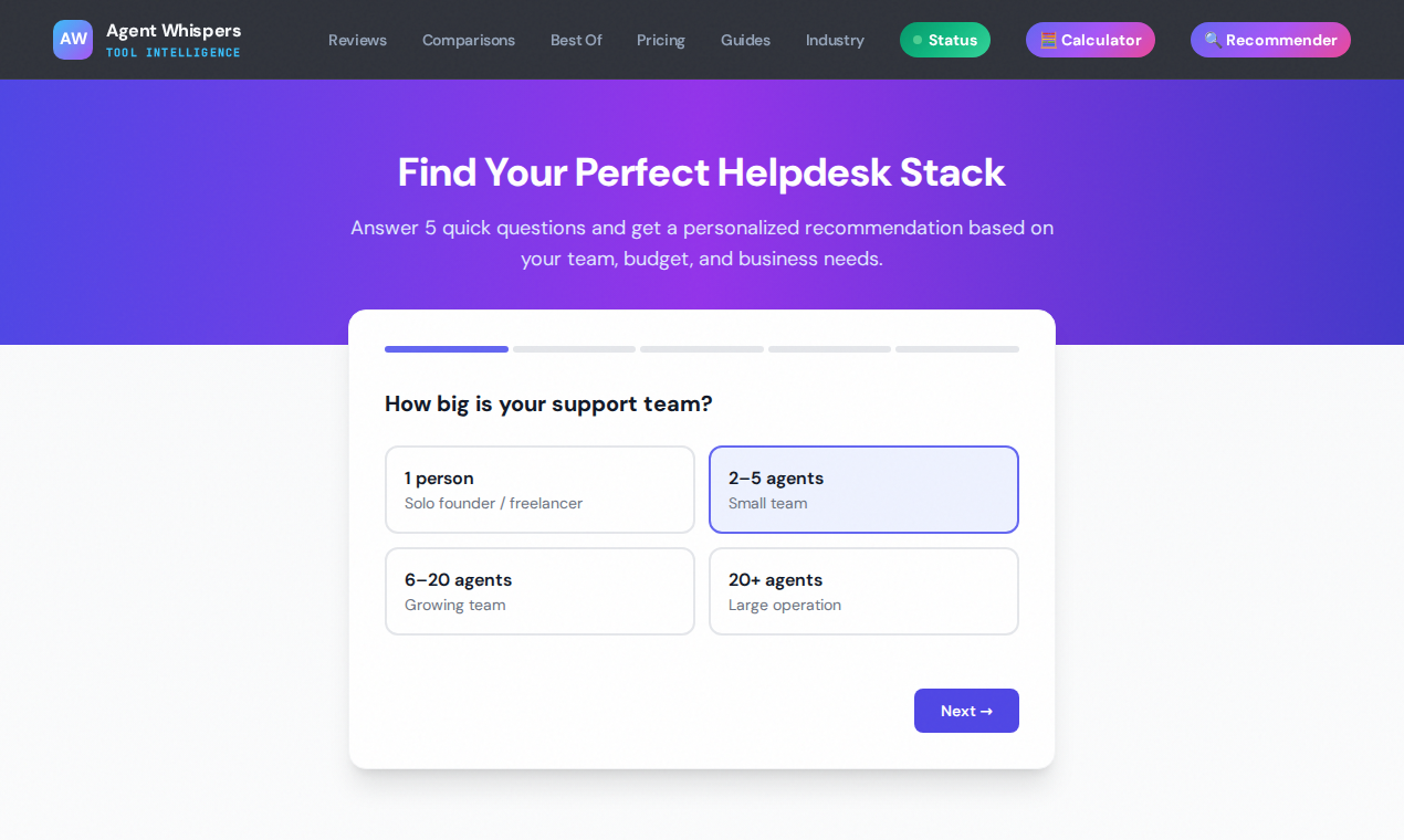 AgentWhispersは、ヘルプデスク領域のソフト選定を迅速化する3つの無料ツールを提供します。料金計算機でチーム規模ごとの実費を見積もり、5ステップのスタック推奨で最適なツールを提案、12...
