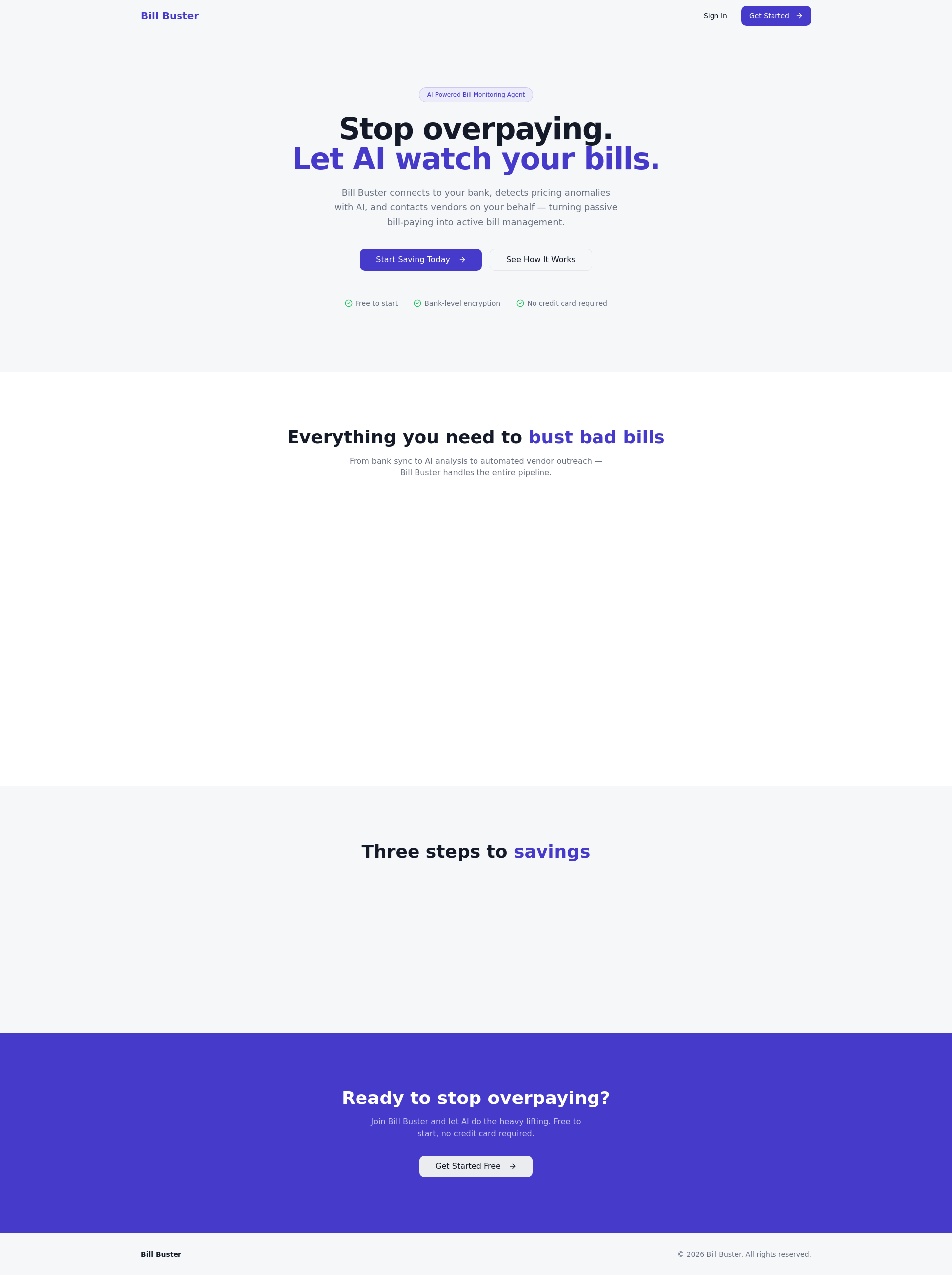 Bill Buster は、購読の増殖を自動で検出し、増額通知が家計を圧迫する前に対処する自律型AIエージェントです。Plaid で銀行口座と連携し、Gemini AI を用いて過去90日分の継...