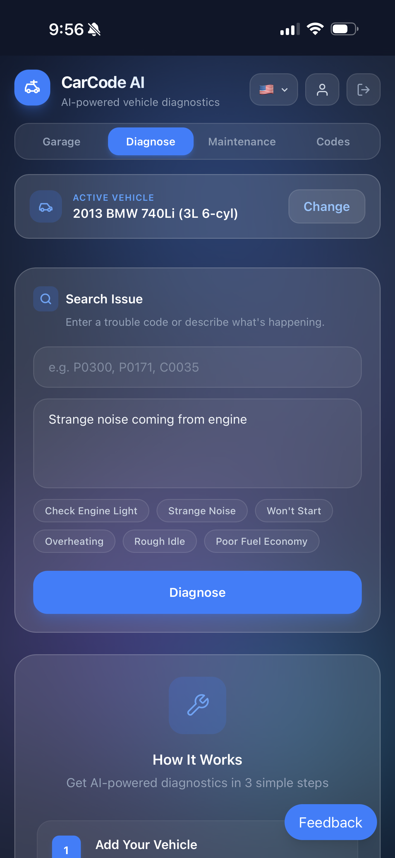 ## 概要 CarCodeAI は、OBD-II のトラブルコードと症状を AI で解釈し、わかりやすい解説、候補となる原因(順位付き)、まず自分で確認できる手順、次に取るべき行動のガイドを提供...