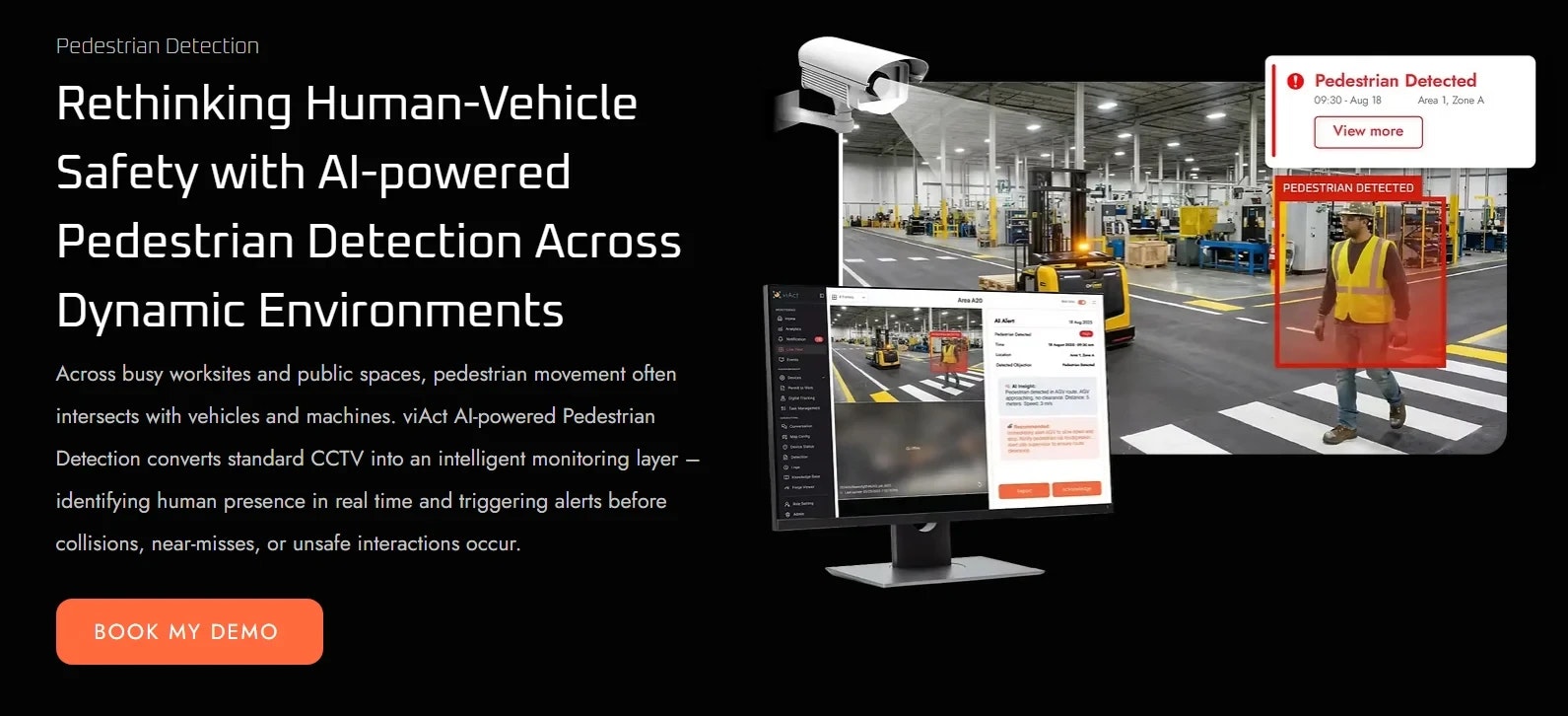 viActは、AI動画分析を用いたリアルタイムの歩行者検知により、産業現場や公共空間での歩行者との衝突を未然に防ぎ、ニアミスを削減します。高精度の検出と即時アラート機能で現場の安全性を向上させ、...