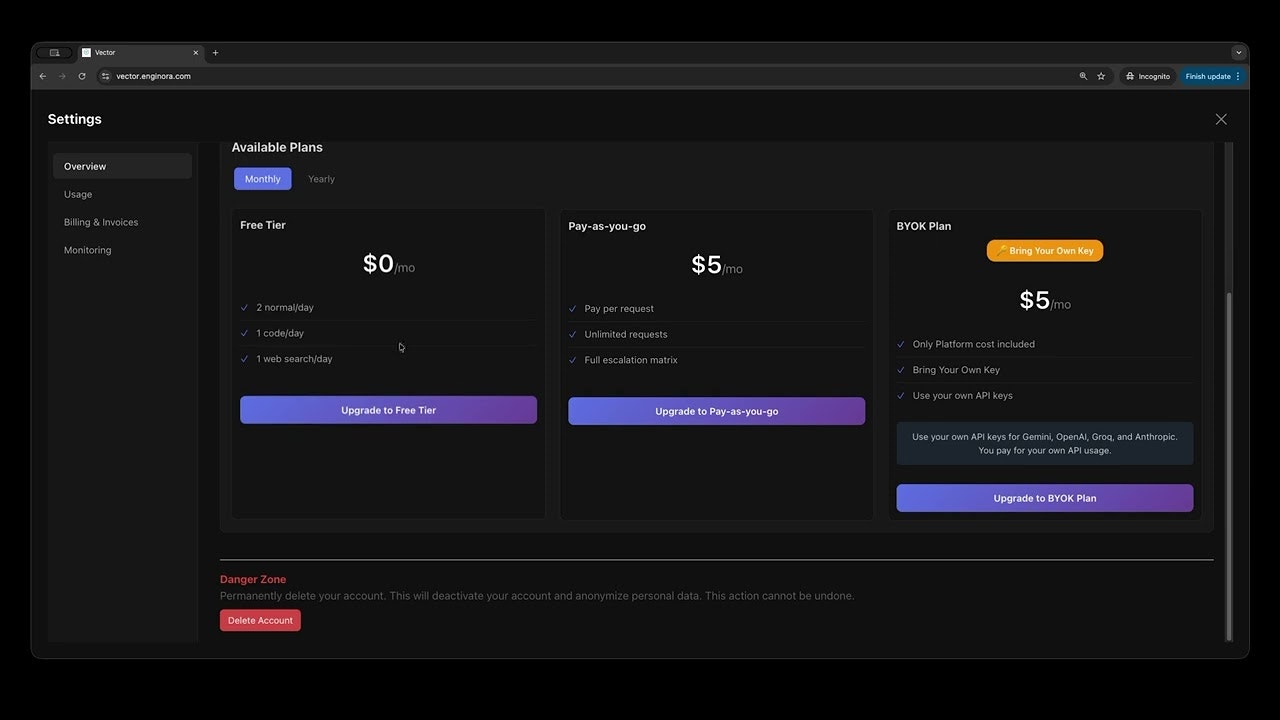 ##概要 Vectorは、複数の生成モデルを自動的に最適化してルーティングする賢いルーティングプラットフォームです。クエリの複雑さ・領域の機微性・リスク評価に基づくスマートなモデル選択で、品質を...