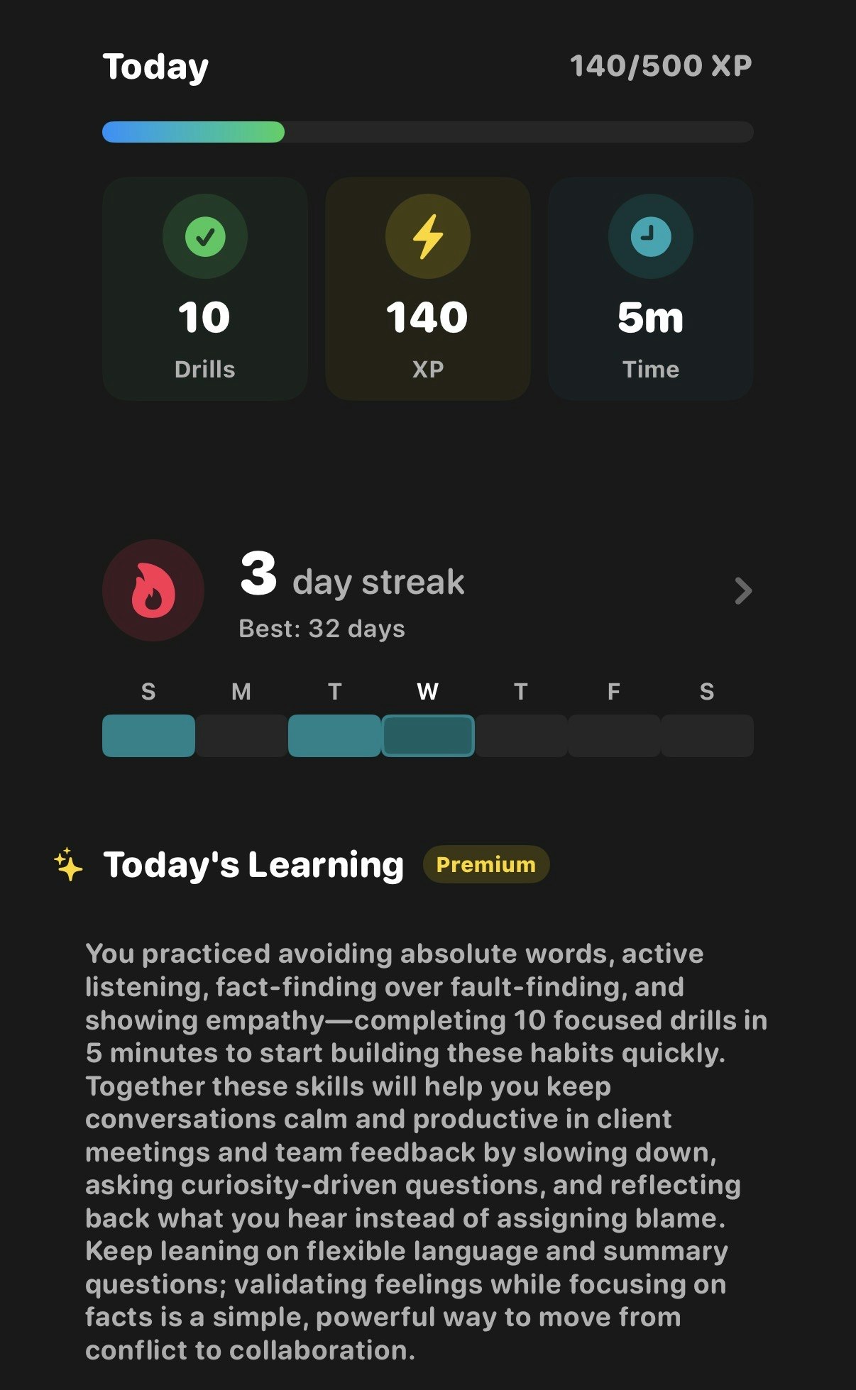 ## 概要 - 毎日5分の職場練習でソフトスキルを身につける、現実的なデモ体験。 - 実在の職場シーンで意思決定を行い、AIフィードバックと振り返りを通じて定着を図る。 - 5分/日、継続を前提...