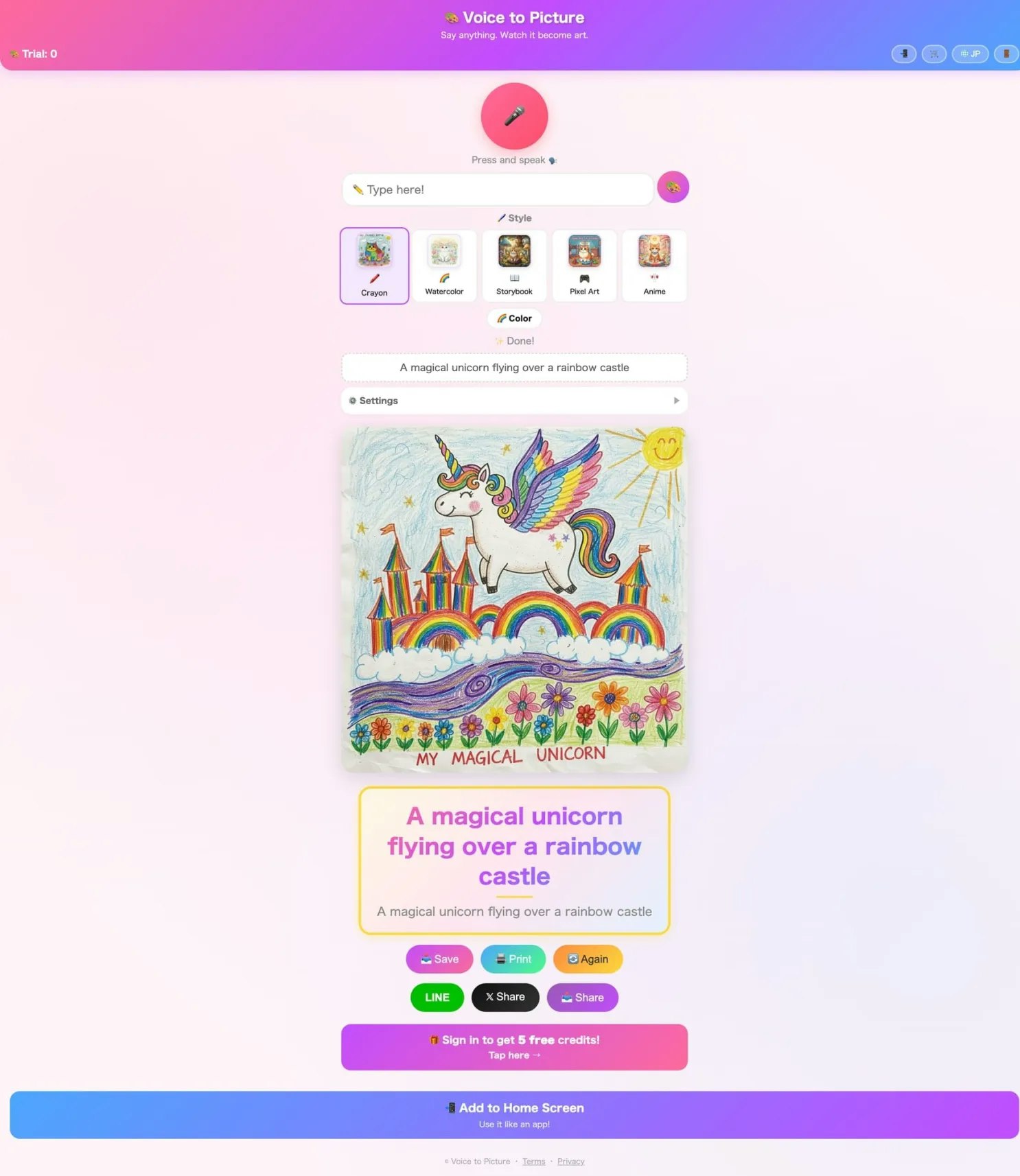 3–12歳の子ども向けAI搭載お絵かきアプリ。話すまたは入力するだけで、AIが数秒で美しいイラストを作成。特徴は音声入力・5つのスタイル(クレヨン風・水彩・絵本風・ピクセルアート・アニメ風)・塗...