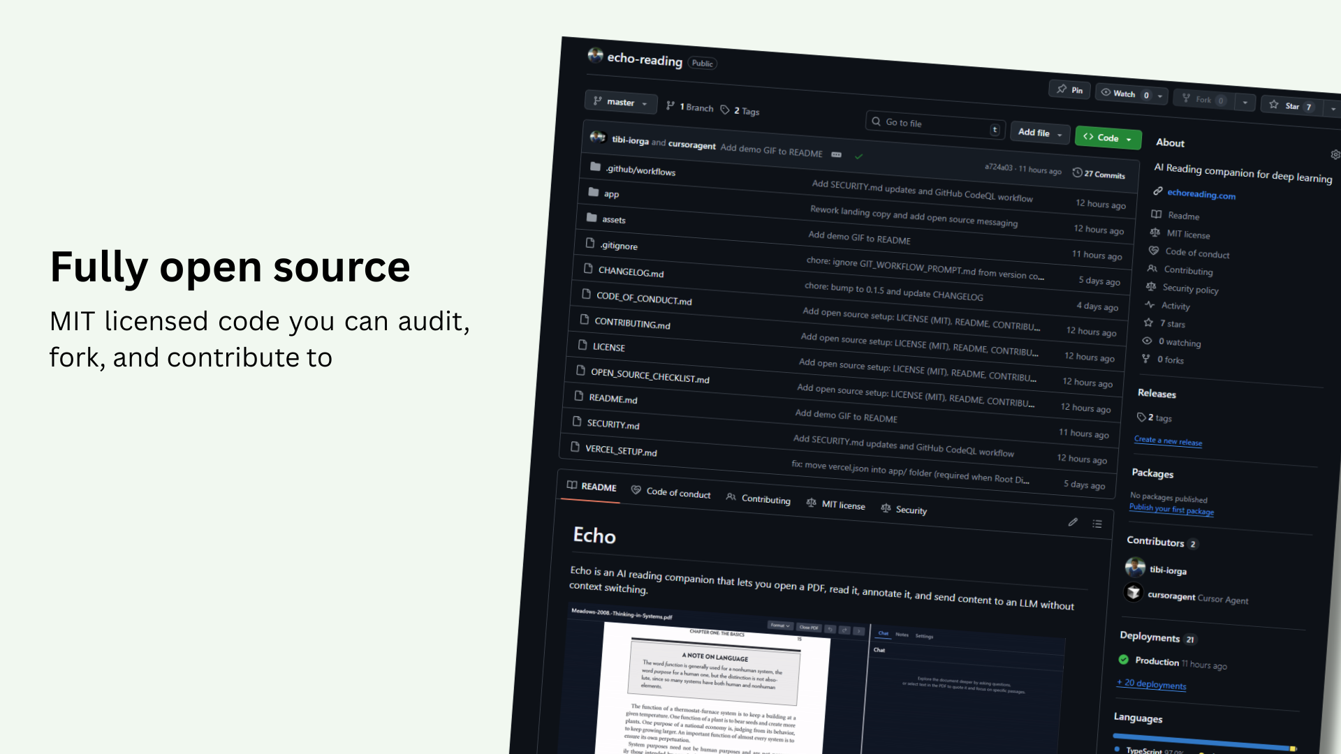 ## 概要 EchoはKindle風のPDFリーダーとAIチャットを統合した読書体験。PDF内の任意テキストを選択してすぐ質問でき、読み取りと会話を同一画面で完結。コピーやタブの切替は不要。デー...