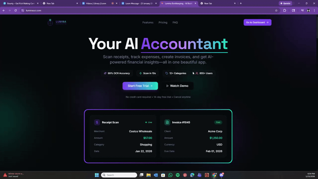 ## 概要 Lumina Bookkeeping は、7ツールを1つに統合するAI簿記プラットフォームです。レシートスキャンは99%の精度で約10秒、43カ国の税法を理解するAIアシスタント、2...