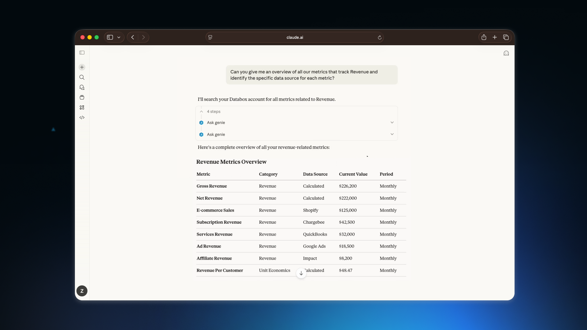 Databox MCPは、DataboxデータをAIツール内で直接対話・活用できるリアルタイムデータエンジンです。ダッシュボードやSQLは不要で、自然言語の質問に即座に回答し、あらゆるソースから...