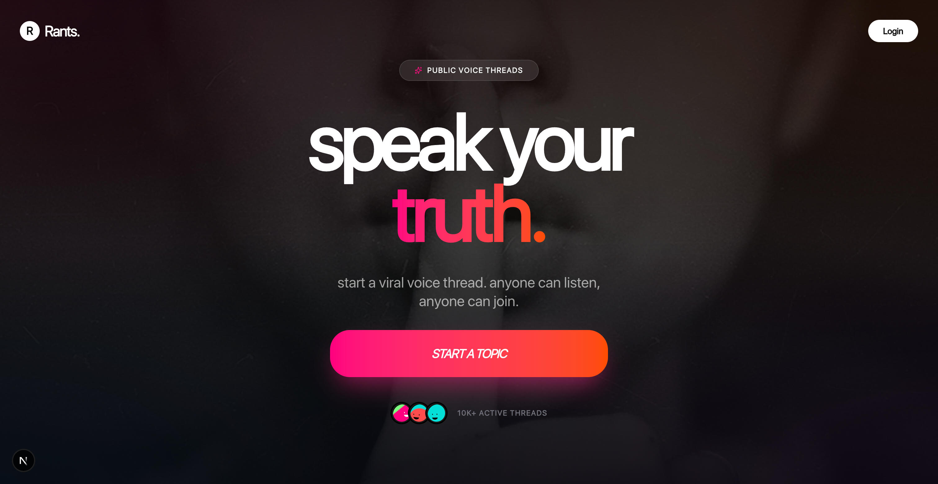 匿名の音声スレッド。トピックを作成して、世界に発言してもらおう。