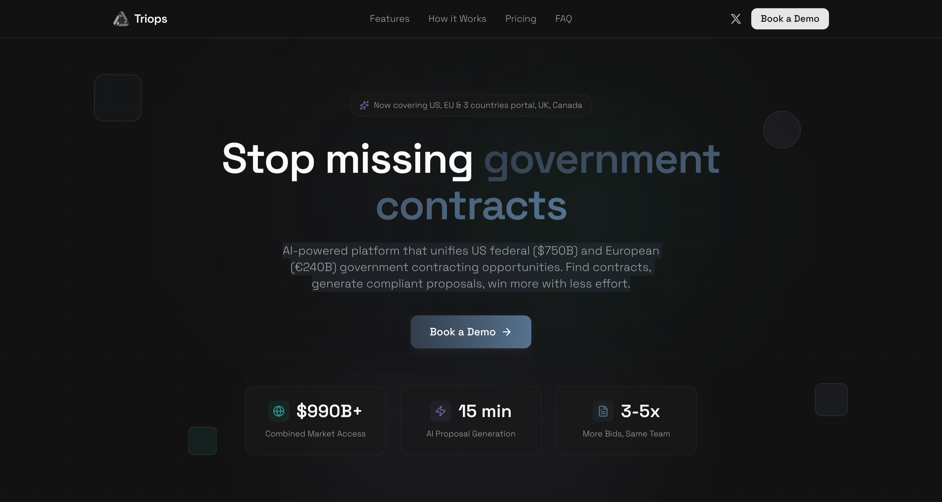 Triopsは、政府機関への入札機会を一元管理し、AIマッチングと提案書自動生成で機会の逃しを減らすプラットフォームです。米国連邦市場(7500億ドル)と欧州市場(2400億ユーロ)を対象に、機...