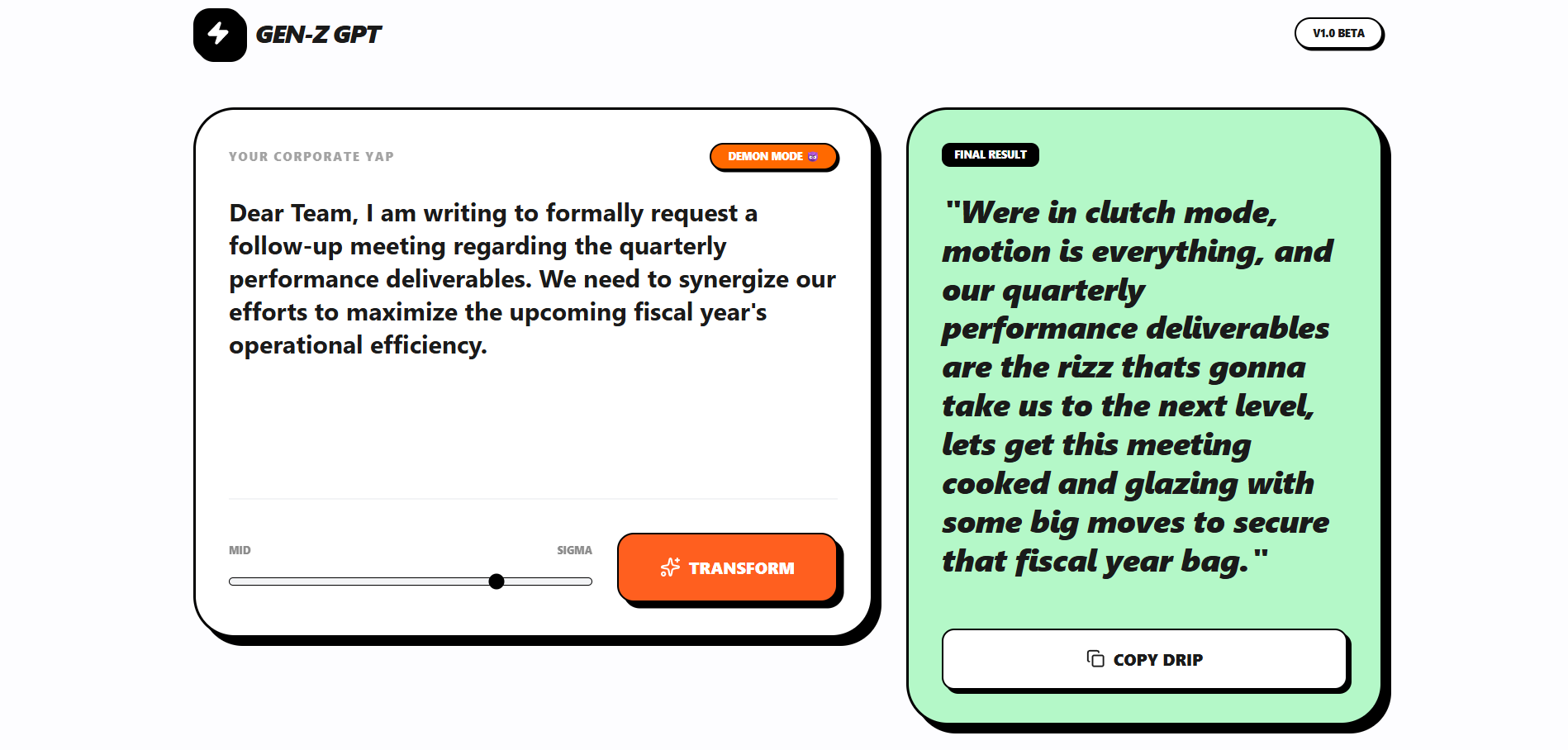 Gen-Z GPT は、AI によって退屈な文章を Gen-Z スラングへ変換する翻訳ツール。Global Kitchen というライブのグローバルフィードを通じて、世界のユーザーが“何を作って...