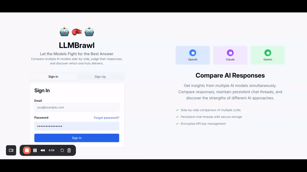 LLMBrawl は、複数のAIモデルを横並びで比較し、同一プロンプトの回答を一か所で判断できるツールです。各モデルは独自のコンテキストを保持するため、推論の違い・創造性・正確さの差が分かりやす...