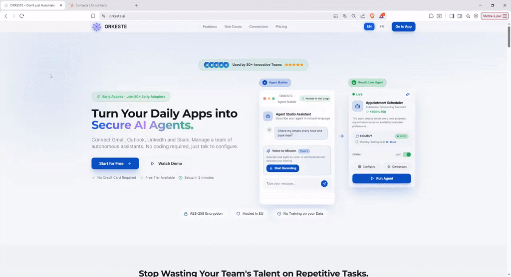 Orkeste は自然言語だけでアプリをつなぐAIワークスペース。50ノードの複雑な設定を避け、英語の指示だけでワークフローを組み立てられる点が特徴。ヒューマン・イン・ザ・ループにより、支払いや...