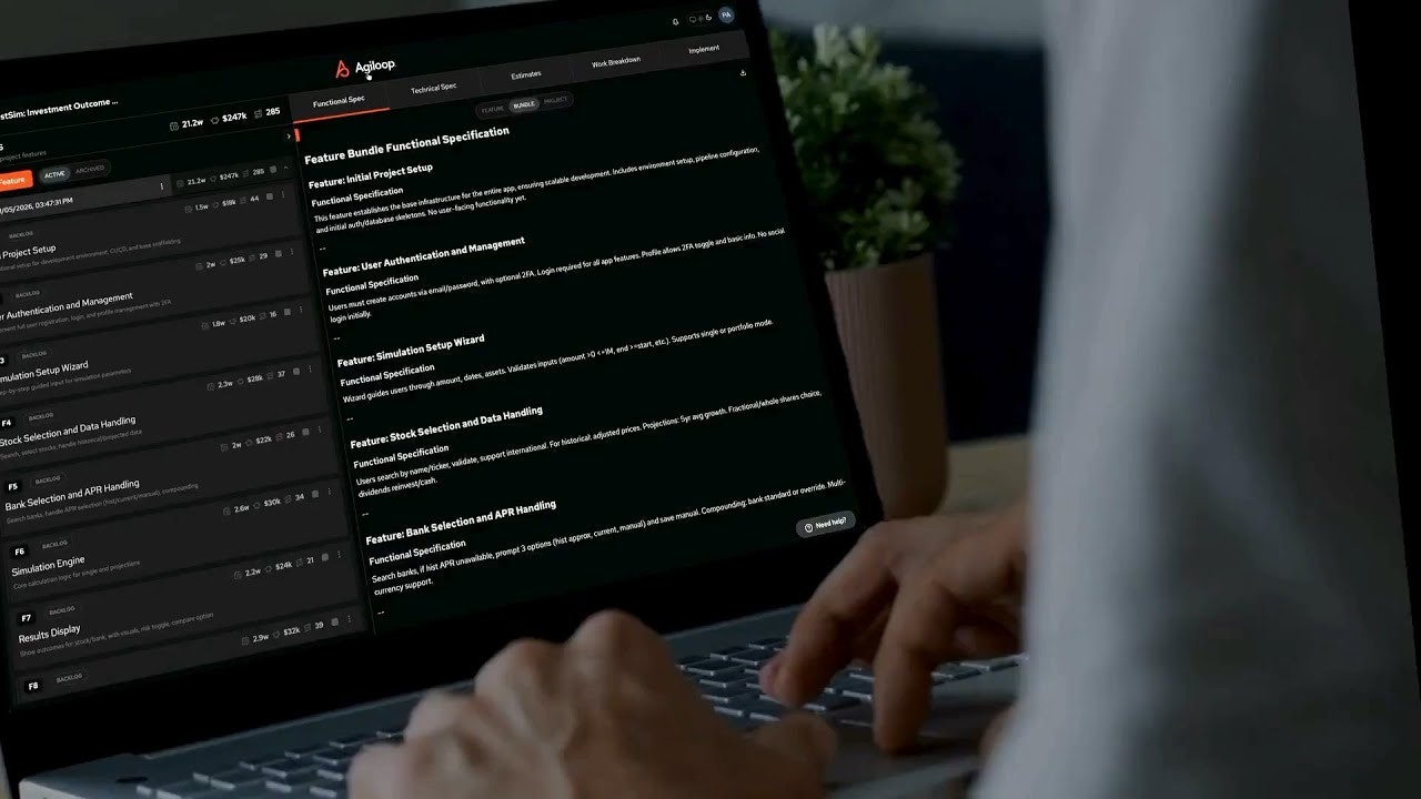 AIを活用したアイデアの早期設計を実現するツール。ガイド付きインタビューで機能、ユーザーストーリー、仕様、リソース見積もりを自動生成し、Jira・Azure DevOps・Trello・Exce...