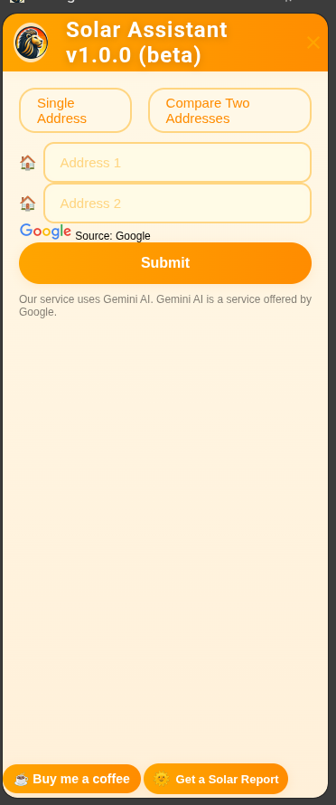 AI搭載の太陽光インサイトをブラウザ上で提供するChrome拡張機能。任意の米国住所の太陽光ポテンシャルを即時表示し、2物件を横並びで比較。日照時間・パネル容量・発電量・炭素削減量を推定し、難解...