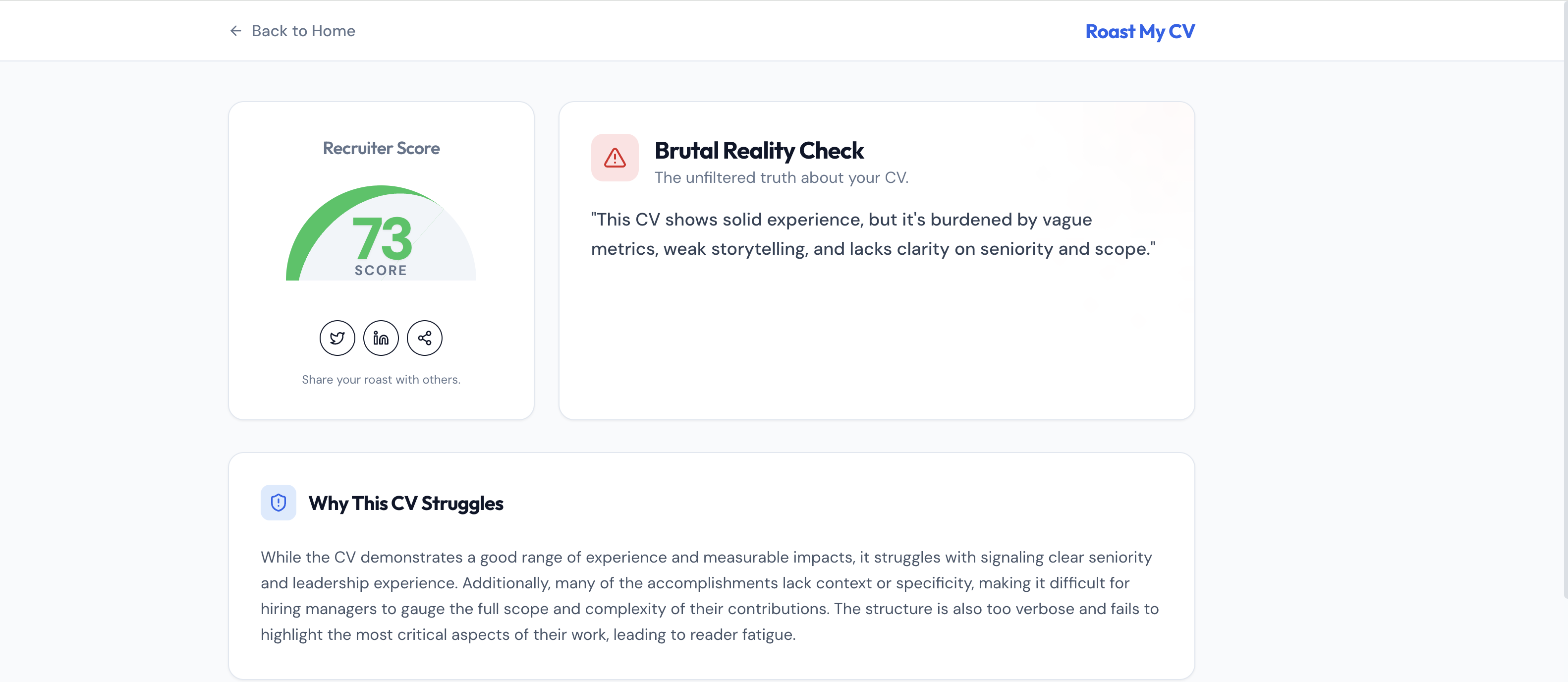 ## 概要 AIが提供する徹底的に正直な履歴書フィードバック。曖昧さを排し、弱点や混乱点、採用担当者が見落す可能性の高いポイントを明確に指摘します。デザイン・技術・ビジネス問わず、より自信を持っ...