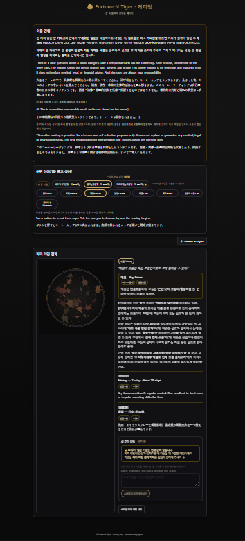 Fortune N Tiger は、サジュ・タロット・相性・曼荼羅風分析を統合したAI駆動の韓国式占いプラットフォームです。運命の表層予測ではなく、時間軸・人間関係・キャリア・ライフサイクルを通...
