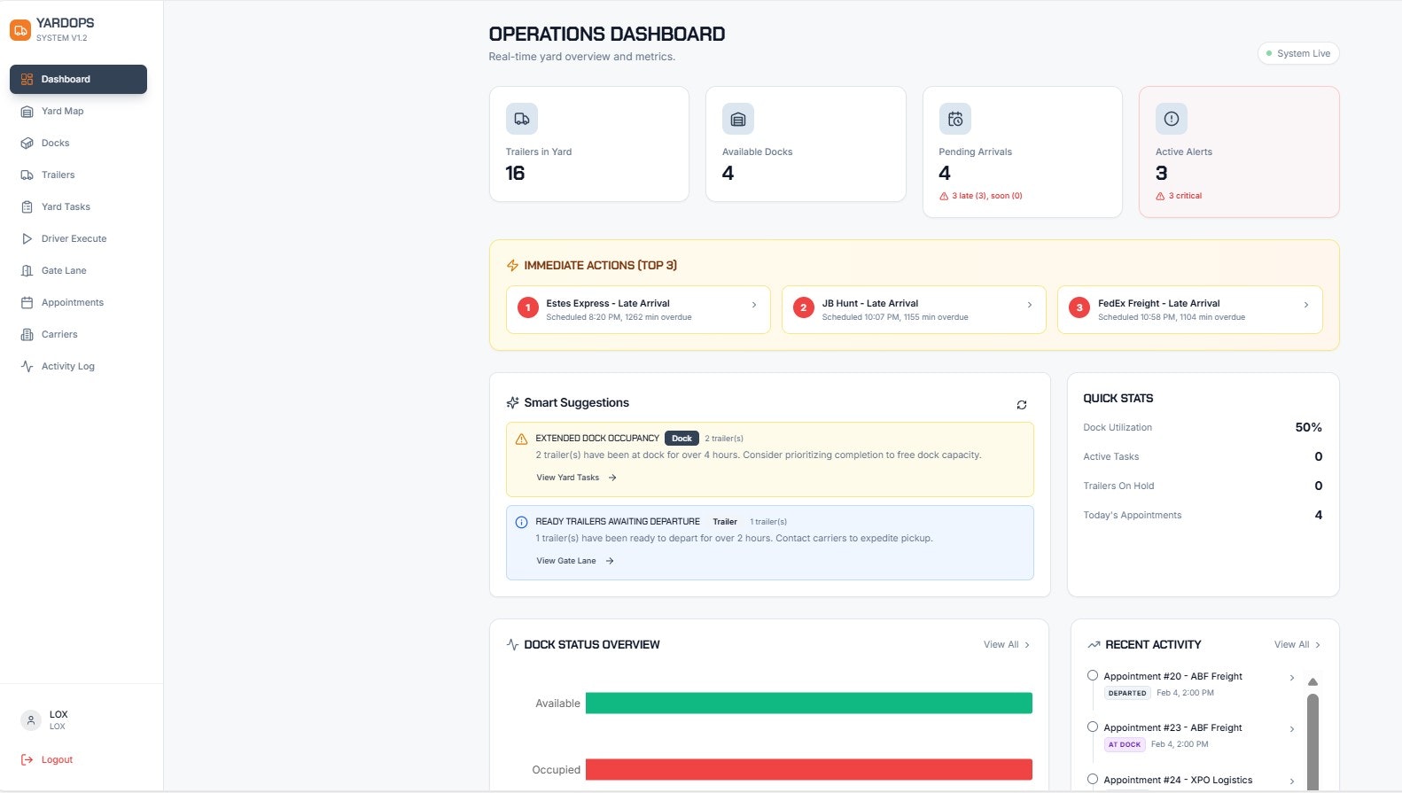 ## 概要 YardOpsは、AIを活用して実務者がエンタープライズ向け物流ツールを迅速にプロトタイプできることを示すヤード管理のPoCです。予約ベースのゲートチェックイン、トレーラのライフサイ...