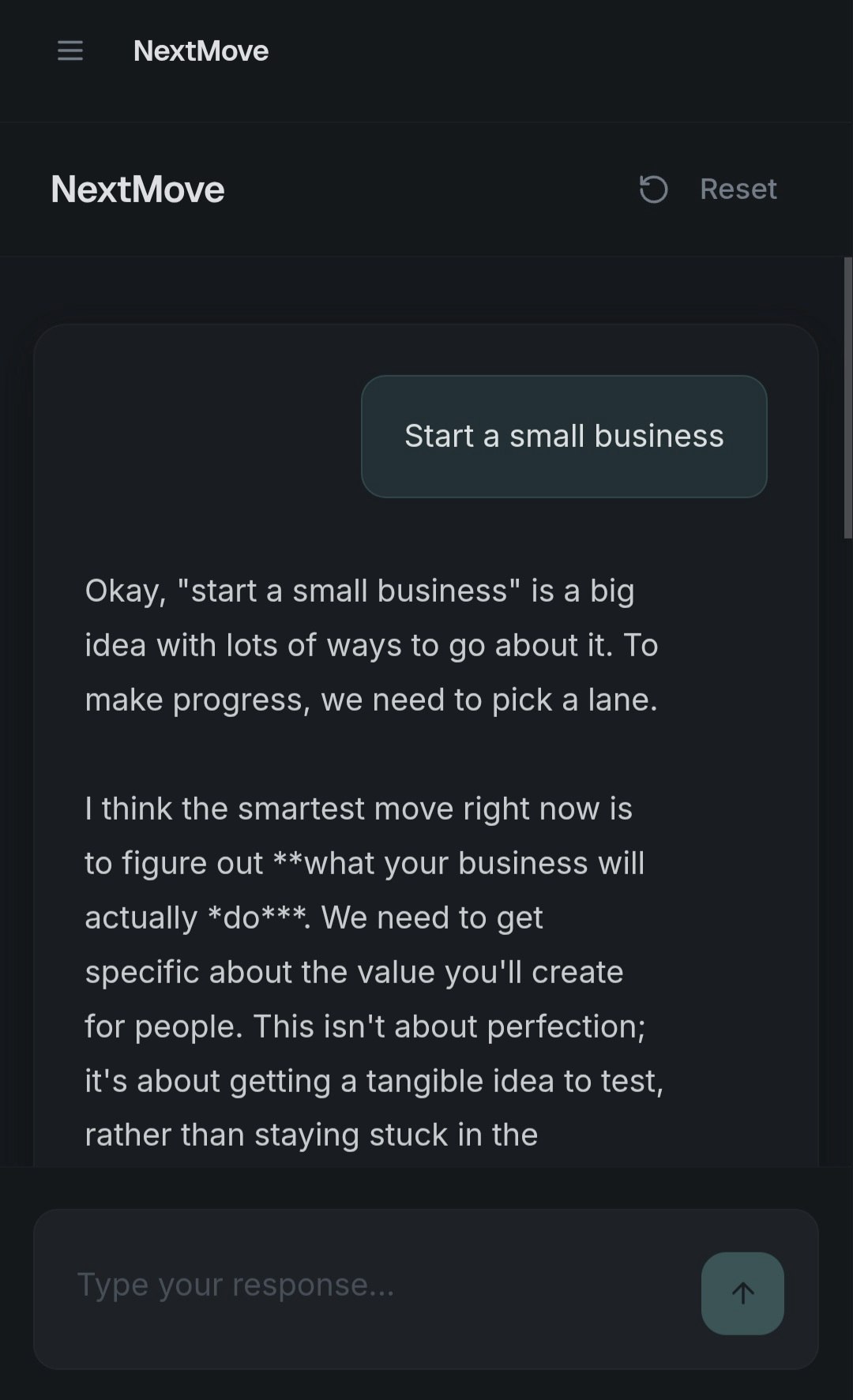## 概要 NextMove は、アイデアや決断に直面する人に向け、1つの明確で実用的な次のステップを提供する MVP です。長い計画や一般論に頼らず、現状に基づく具体的な行動をすぐに提案します...