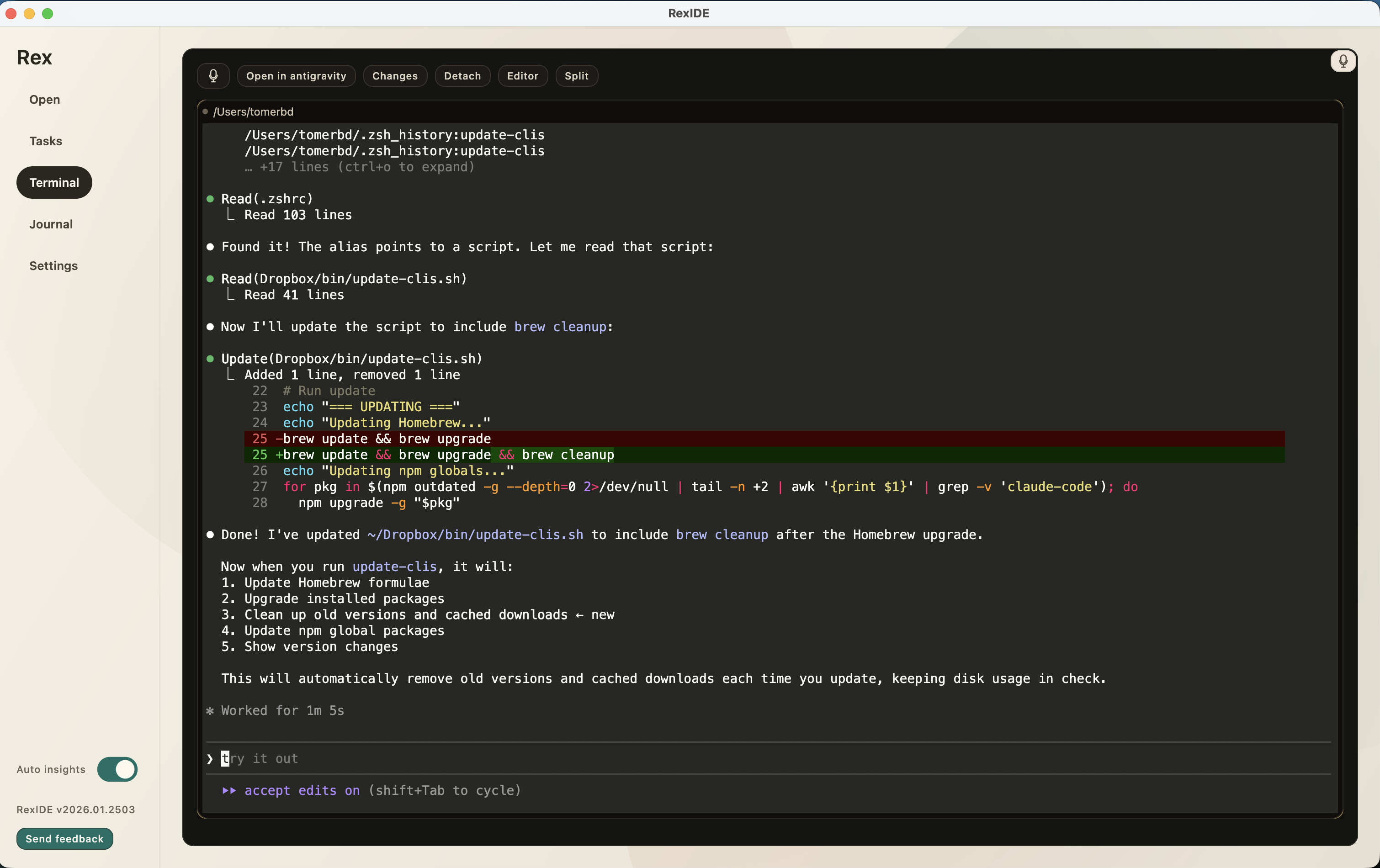 ## 概要 RexIDE は AI エージェント用の次世代 IDE コマンドセンター。複数リポジトリやターミナル、コードレビュー、差分の自動インサイト、差分ビュー、音声入力などを一つの連続したフ...