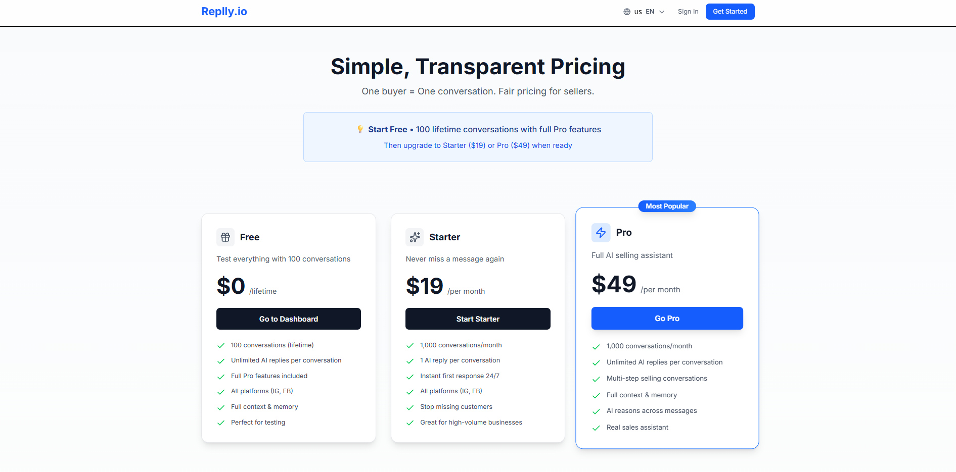 RepllyはAI搭載のチャットボットで、ソーシャルメディアのDMやコメントに自動で返信します。ソーシャルセラーや小規模ビジネスが返信速度を向上させ、リードを逃さず獲得するのを支援します。主な機...