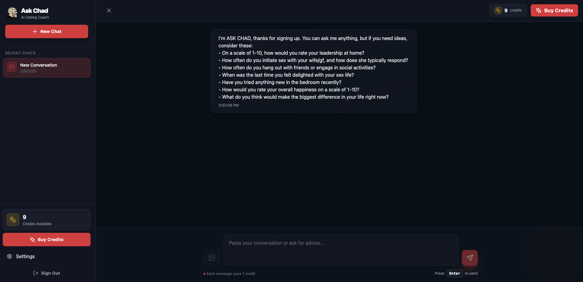 ##概要 AskChad AIは男性向けの24/7リアルタイムAIデートコーチ。実際の会話データに基づく個別アドバイスを、会話中にも提供します。 ##特徴 - 実績ベースのリアルタイム文脈対応...