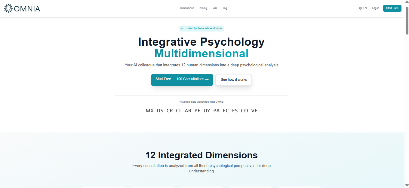 OmniaはAIを活用した統合分析プラットフォームで、精神保健の専門家や補完的アプローチを用いる専門家を支援します。心理療法士・心理学者・統合コーチなど、複雑なケースを多次元に分析するニーズに応...