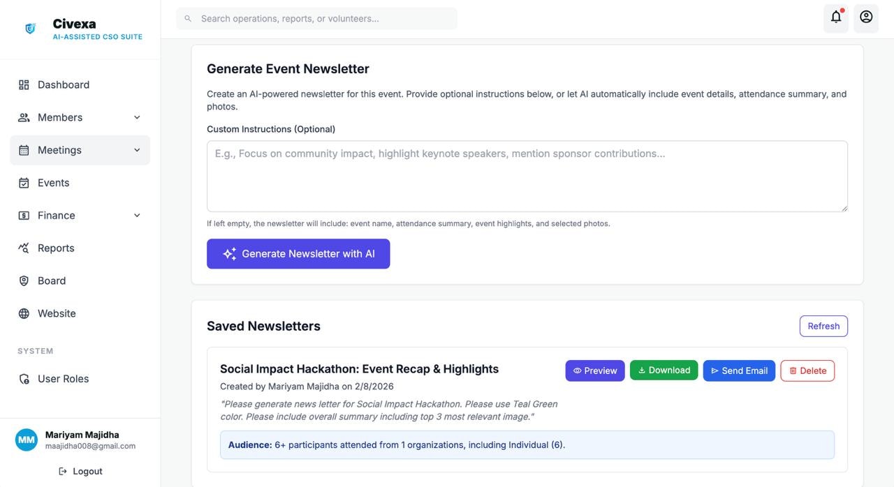 ## 概要 モルディブ向けの AI 支援CSO運用スイート。NGO/CSOが会員・イベント・プロジェクト・レポート・コンプライアンスを1つのシステムで管理します。 ## 主な特徴 - AI が...