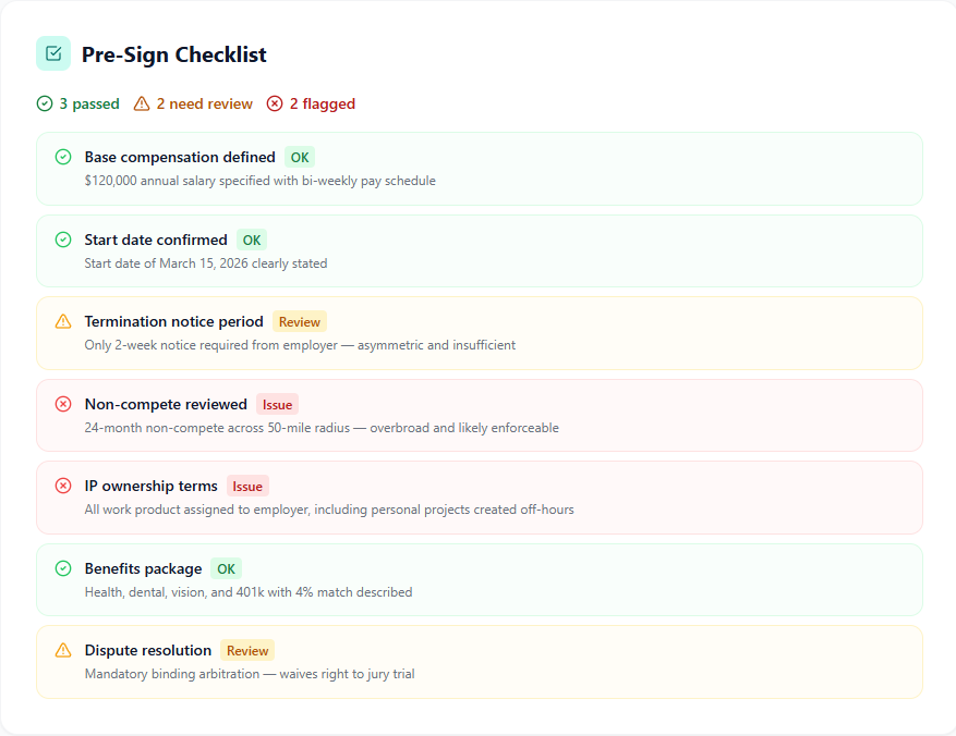 Paste any contract. Get a plain-English breakdown of every clause, red flags highlighted, exact r...