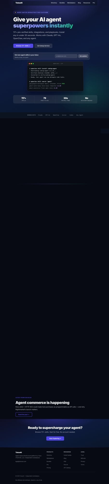 AI agents can reason but can't act — they lack tools. TutuoAI is agent-native infrastructure: ski...
