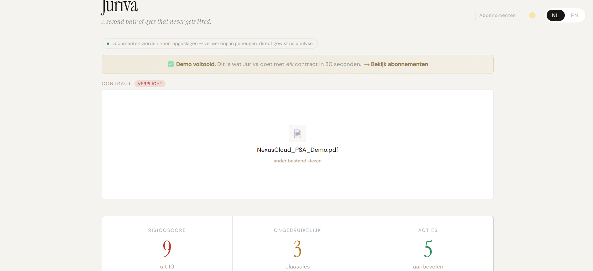 Juriva analyses contracts in less than 30 seconds. It provides a risk score, number of unusual cl...