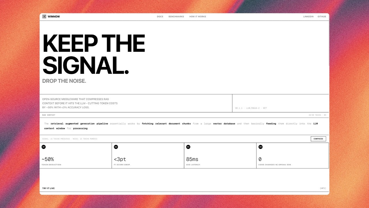Winnow compresses RAG prompts before they hit your LLM, cutting token costs 50%+ while preserving...