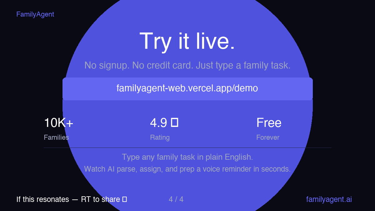 FamilyAgent turns natural language into coordinated family action. Speak or type to delegate task...