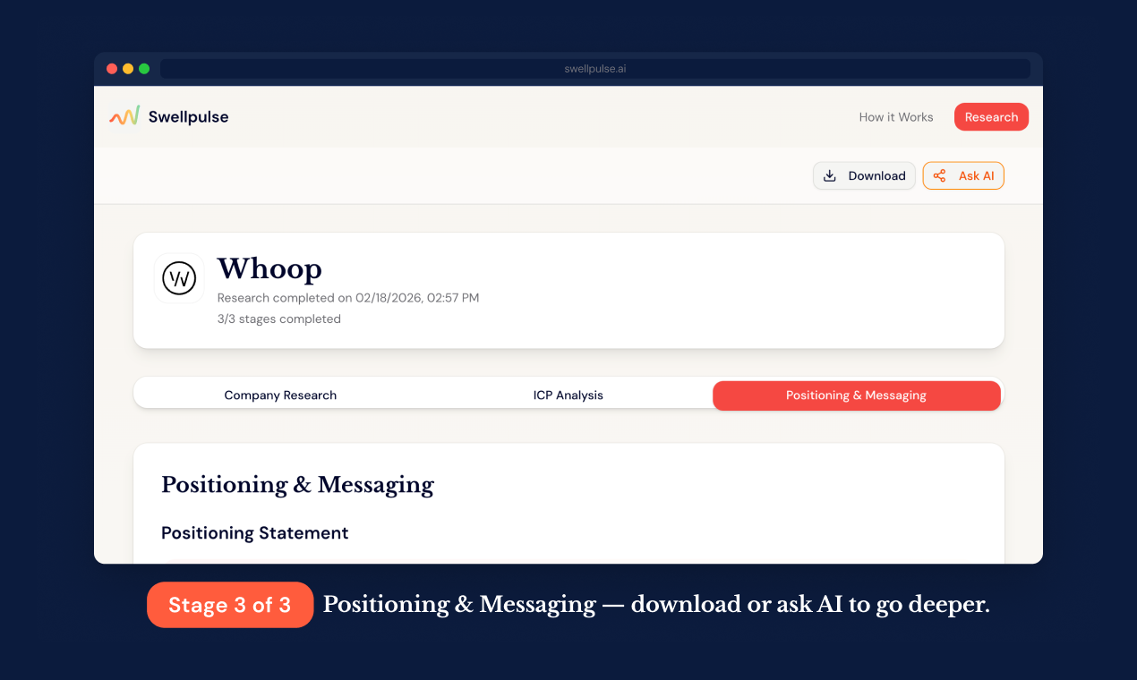 Marketing research used to take weeks. 47 browser tabs. Zero coherence. Swellpulse does it in 3 m...