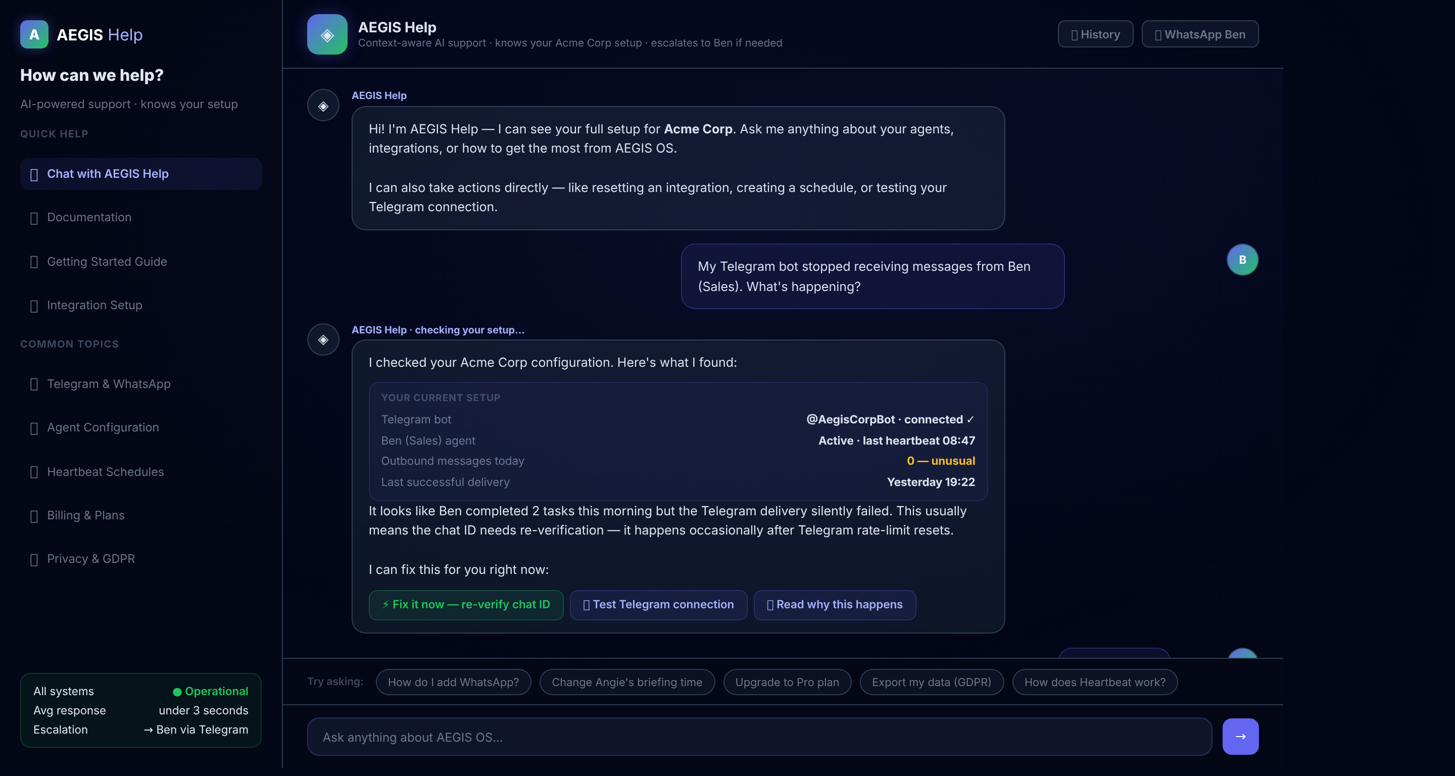 AEGIS OS is your full AI executive team running 24/7 via Telegram & WhatsApp. 7 autonomous agents...
