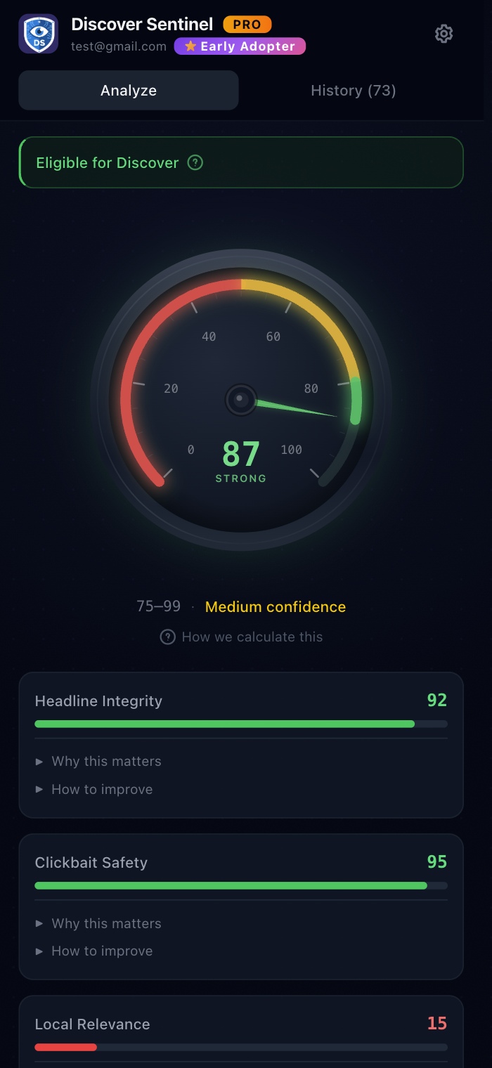 AI-powered Chrome extension and web application that analyzes articles against Google Discover ru...