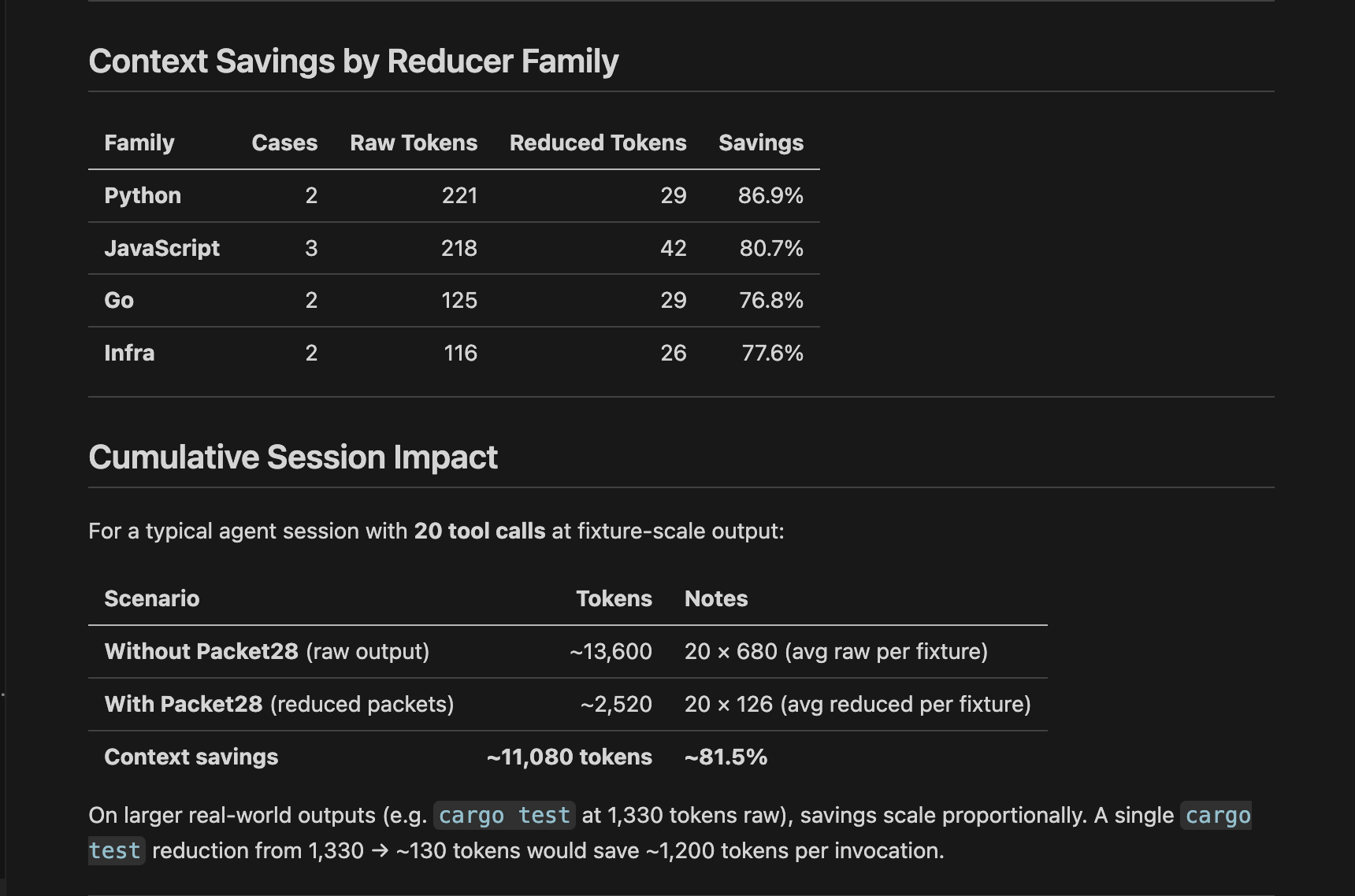 Packet28 manages your agent's context window so it conserves tokens. 164x fewer tokens on large c...