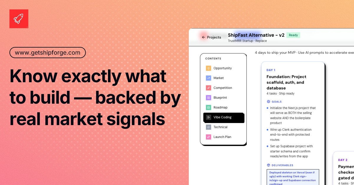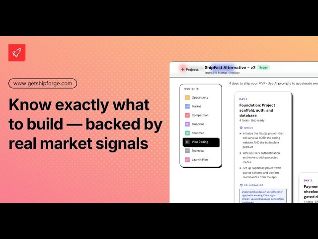 ShipForge analyzes your startup idea using real-time data from TrustMRR and Acquire.com — pulling...