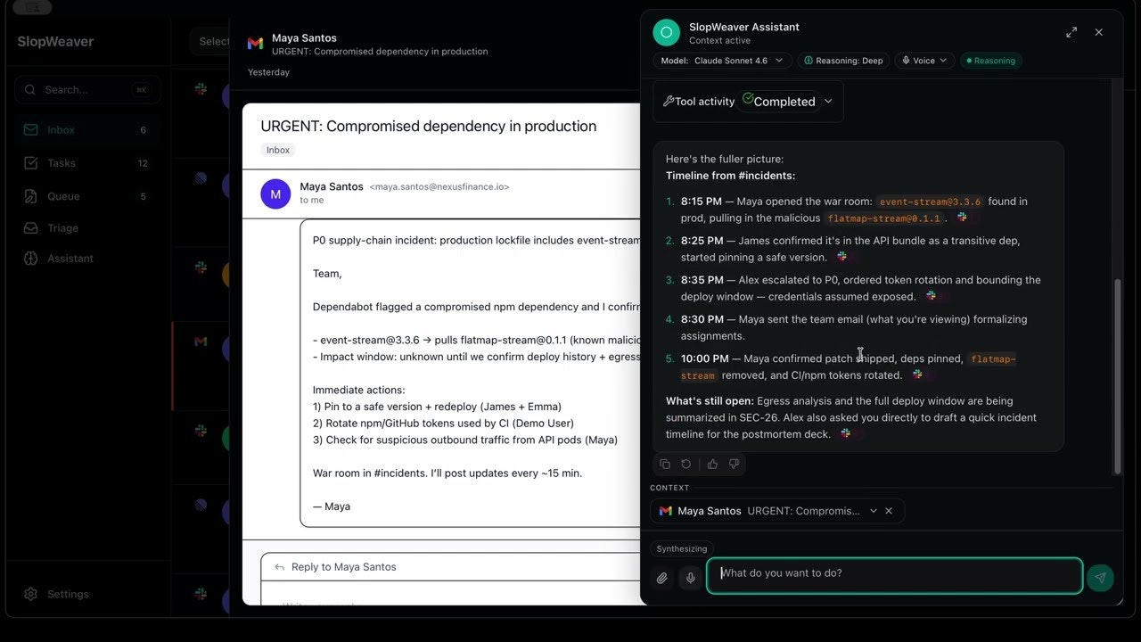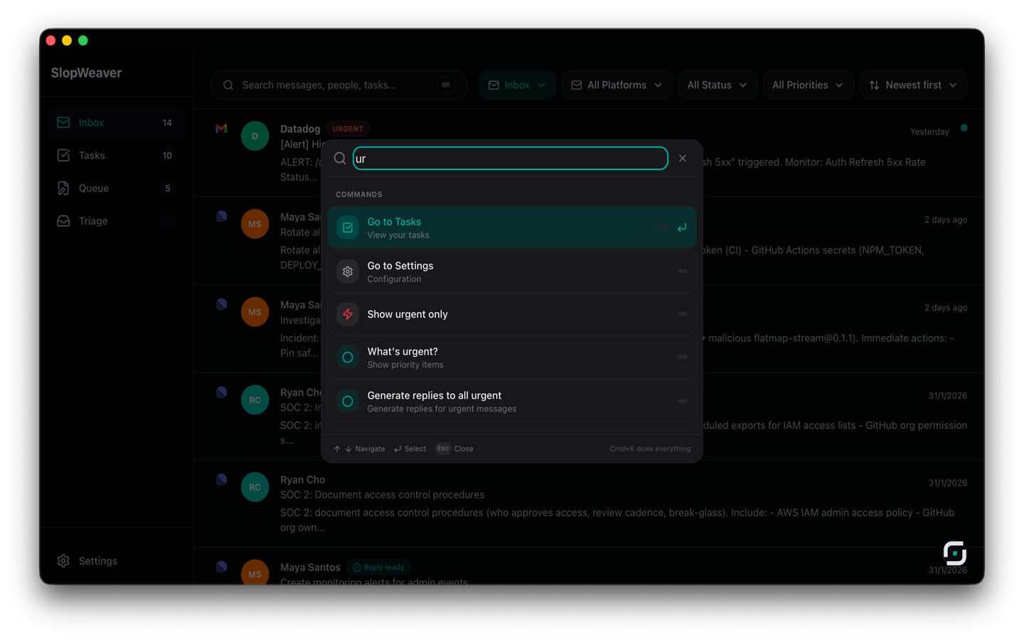 SlopWeaver turns Slack, Gmail, and your task tools into one reviewed queue. It pulls grounded con...