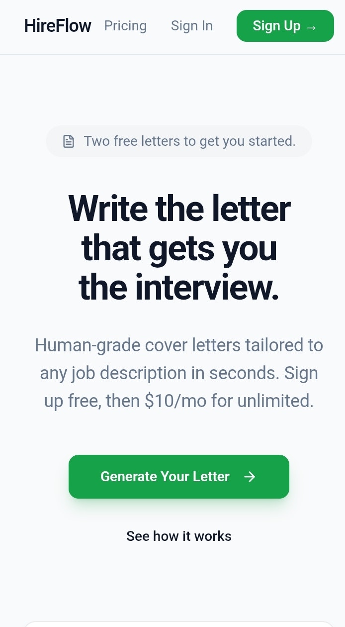 Generate human-grade cover letters tailored to any job description in seconds. Two letters free, ...