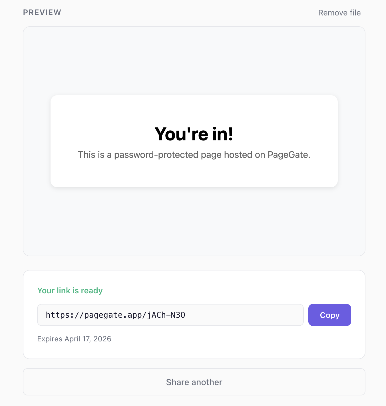 Drop in an HTML file you made with AI. Get a shareable link.