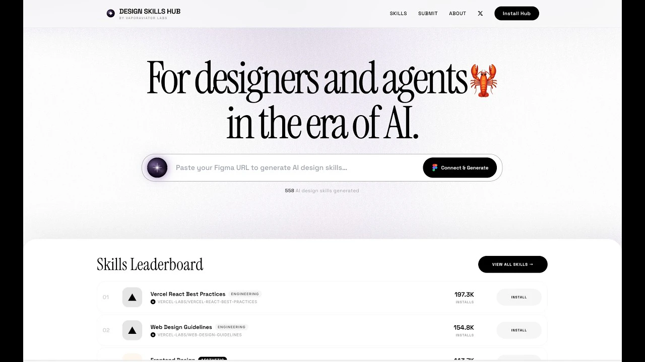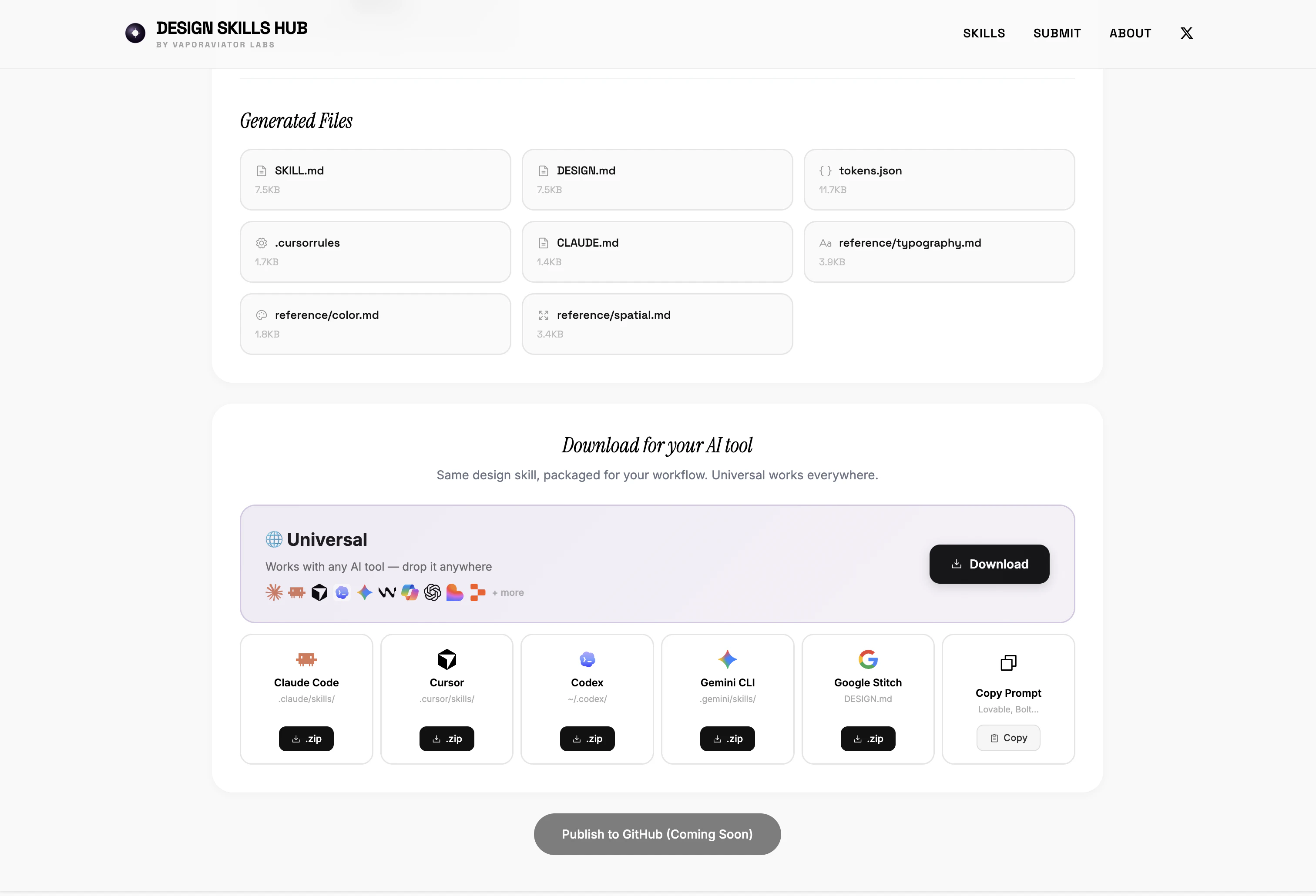 Paste a Figma URL → we extract your design system (colors, type, spacing) → download a skill file...