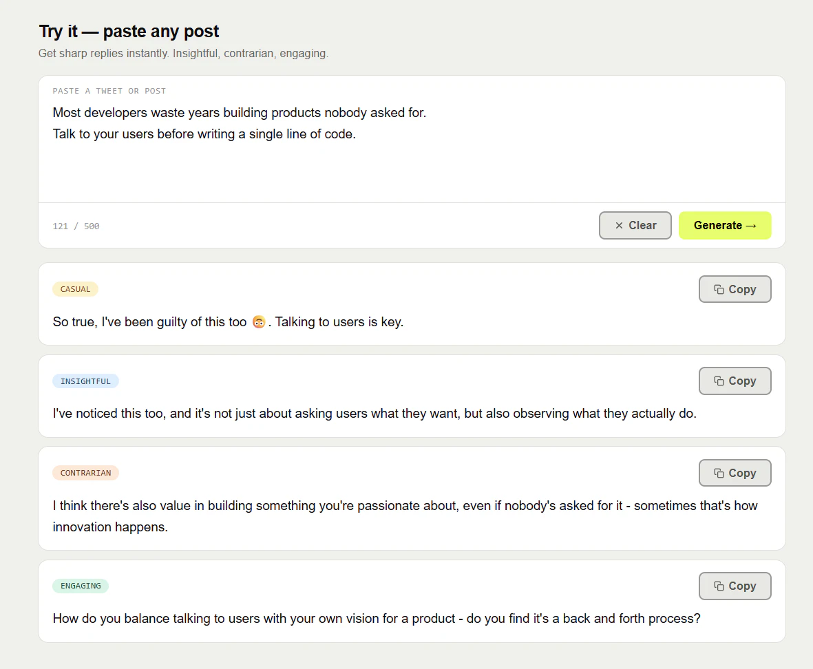 ReplyGuy helps X (Twitter) creators write better replies instantly. Paste any post → get 4 AI-gen...