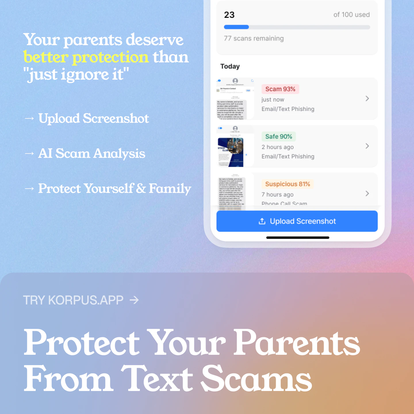 Korpus.app helps you instantly check if a text message is a scam. Just upload a screenshot and ge...